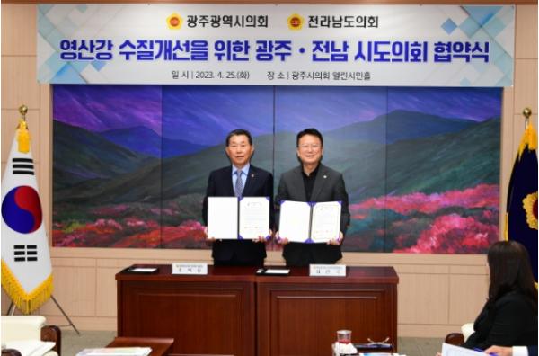 25일, 광주광역시의회 환경복지위원회(위원장 조석호)와 전라남도 보건복지환경위원회(위원장 최선국)는 영산강 수질개선 문제에 공동으로 대응하기 위한 업무 협약을 체결했다.