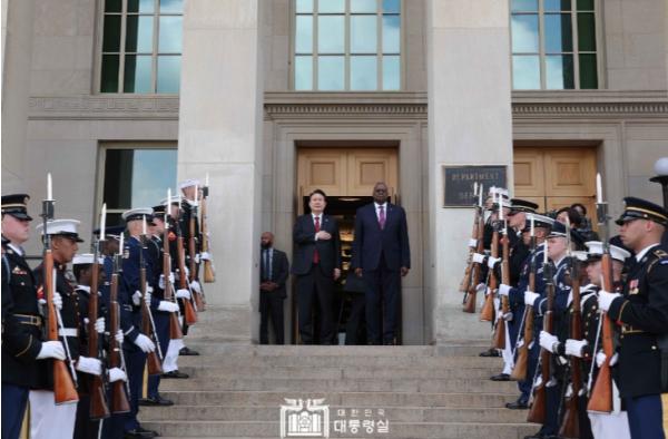 [중앙뉴스라인, 우제헌기자] 미국을 국빈 방문 중인 윤석열 대통령은 4. 27일 오후 미국 버지니아주에 위치한 美 국방부(펜타곤)를 방문해 로이드 오스틴(Lloyd J. Austin Ⅲ) 美 국방장관과 대담을 하고, 확장억제의 실효적 강화방안, 인태지역 안보협력 등 주요현안에 대해 의견을 나누었다.