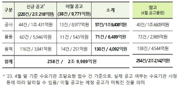 이 가운데 신규 공고는 220건, 2조 218억원, 이월 공고는 38건, 9,771억 원 규모다.