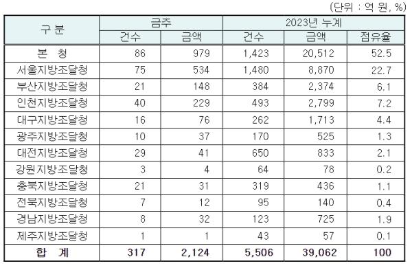 지역별 발주량을 보면 대전광역시 소재 본청 979억 원, 서울지방청 534억 원 등 2개청(1,513억 원)이 전체 금액(2,124억 원)의 71.2%를 차지하고 있으며, 인천 등 나머지 10개 지방청 611억 원이 각각 집행될 예정이다.