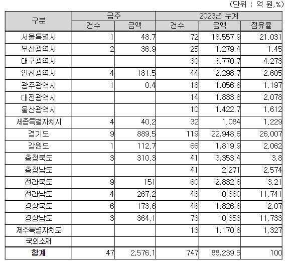 지역별로는 경기도 890억 원, 경상남도 364억 원, 충청북도 310억 원, 그 밖의 지역이 1,012억 원이다.