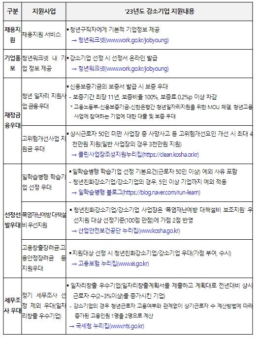 한편, 고용노동부는 강소기업 선정기준에서 더 나아가 청년친화적 근로 여건을 갖춘 기업을 청년친화강소기업으로 선정하여 추가 혜택을 부여할 계획이다. 청년친화강소기업 신청공고는 8월 고용노동부 누리집에서 확인할 수 있으며, 올해 선정된 강소기업에는 신청 관련 정보를 별도 안내할 예정이다.