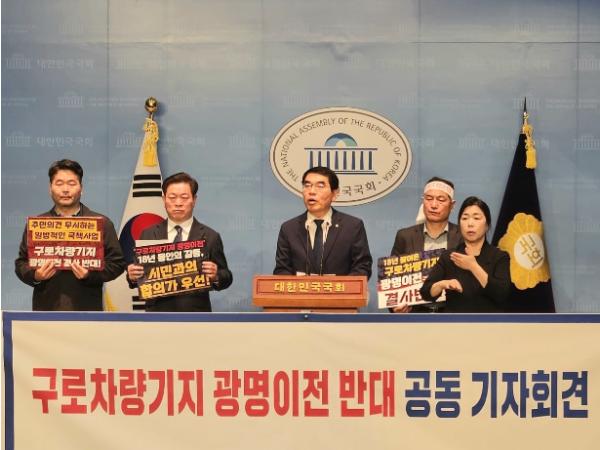 이날 기자회견에는 박승원 광명시장과 이승호 구로차량기지 광명이전반대 공동대책위원회 위원장 등이 함께 참여했다.