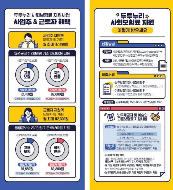 특히, 올해 지원 대상은 월 보수요건이 260만 원 미만으로 전년(230만 원 미만) 대비 크게 확대됐으며, 예술인과 노무제공자의 경우 종사자 부담분에 한해 사업 규모와 상관없이 고용보험료를 지원받을 수 있게 변경됐다.