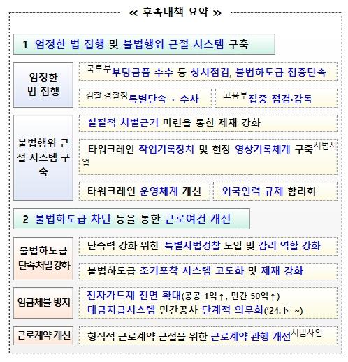 이에 당정은 항구적인 불법행위 근절을 위한 제도적 기반 구축을 위해 월례비 수수, 공사방해 등 처벌근거가 모호한 부당행위에 대한 제재기반을 강화하고, 데이터에 기초한 투명한 노무 및 안전 관리를 위해 건설현장 원격 모니터링체계 및 타워크레인 스마트 작업기록장치를 도입하기로 했다.