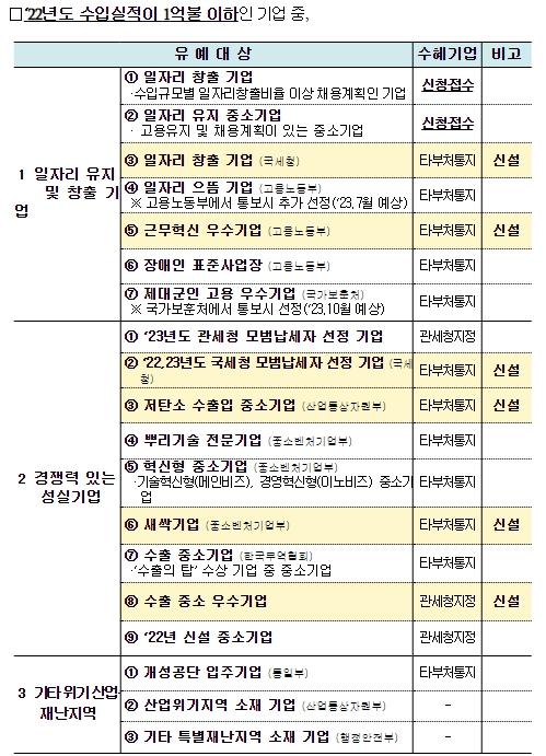 특히 이번 관세조사 유예 대상에는 부처 간 협업 활성화 차원에서 타 부처 선정 우수기업 및 정책적인 우대 분야가 대폭 반영되어 총 14개 분야(5개 신설) 2만여 개 기업이 이에 해당될 것으로 예상했다.