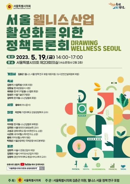 [중앙뉴스라인, 이승훈기자] 서울특별시의회 도시안전건설위원회와 ‘웰니스 서울 정책 연구 포럼’ 대표의원으로 활동 중인 김춘곤 의원(국민의힘, 강서4)은 오는 5월 19일 오후 2시 서울시의회 제2대회의실(서소문청사 2동 2층)에서 ‘서울 웰니스 산업 활성화를 위한 정책토론회’를 개최한다고 밝혔다.