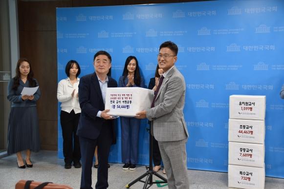 기자회견에 앞서 15일 9시 40분 소통관 앞에서 교사노조연맹은 강득구 의원에게 제42회 스승의 날을 맞아 전국 교사들의 염원을 담은 ‘2023 안전한 교육환경 조성 및 교육정상화를 위한 전국 교원 서명’ 결과지를 전달했다. 서명에는 전국 국공립유치원 교사 1,591명, 초등학교 교사 44,434명, 중·고등학교 교사 7,689명, 특수교사 732명 등 총 54,446명의 교사들이 동참했다.