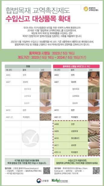 신고 대상이 확대됨에 따라 우리나라에 수입되는 목재제품의 합법벌채 입증 대상이 45%에서 83%로 크게 늘어 국내 목재제품의 투명성이 대폭 개선될 전망이다.