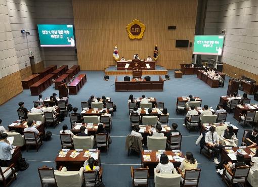16일 시교육청에 따르면 이번 개원식과 제1차 정기회는 고등의회 학생의원들에게 더 실제적인 의회민주주의 경험을 제공하기 위해 기획됐다. 고등의회 운영 사상 처음으로 시의회 본회의장에서 개원식을 진행했고, 학부모와 친구들을 초대해 회의 진행 모습을 공개했다. 이를 통해 학부모는 자녀인 학생의원의 역할에 대한 궁금한 점을 해소할 수 있었다. 또래 친구들에게는 학생자치의 선도적인 모델을 직접 체험하는 좋은 기회가 될 전망이다.