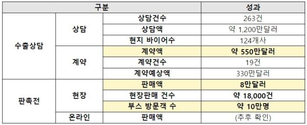 이번 행사에는 일본 진출을 희망하는 뷰티, 생활용품, 식품 등 소비재 분야 중소기업 40개사가 참여했으며, 11일에 도쿄 국제포럼(Tokyo International Forum)에서 개최된 수출상담회를 통해 현지 바이어 124개사와 263건의 상담을 진행하여 약 550만 달러의 수출계약을 성사시키는 성과를 거두었다.