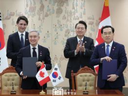 [중앙뉴스라인, 우제헌기자] 윤석열 대통령과 쥐스탱 트뤼도 캐나다 총리가 양해각서 체결식에 참석했다.
