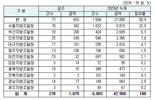 지역별 발주량을 보면 대전광역시 소재 본청 653억 원, 서울지방청 342억 원 등 2개청(995억 원)이 전체 금액(1,879억 원)의 53.0%를 차지하고 있으며, 인천 등 나머지 10개 지방청 884억 원이 각각 집행될 예정이다.