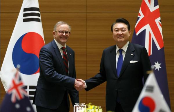 양국 정상은 한국과 호주의 관계가 2021년 ‘포괄적 전략 동반자 관계’로 격상된 것을 계기로 다양한 분야에서 심화되고 있음을 평가했다. 또한 양 정상은 양국이 자유 가치를 공유하는 나라로서 역내 평화를 증진하는데 더욱 긴밀히 협력해 나가자고 했다.