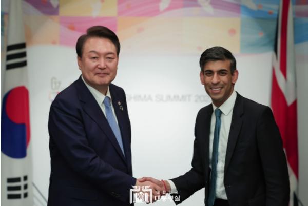 [중앙뉴스라인, 우제헌기자] 윤석열 대통령은 5. 20일 저녁 히로시마 G7 정상회의 참석 계기에 리시 수낙(Rishi Sunak) 영국 총리와 정상회담을 개최해 양국 관계 발전, 실질 협력 강화, 국제정세 동향, 글로벌 협력 방안에 대해 의견을 교환했다.