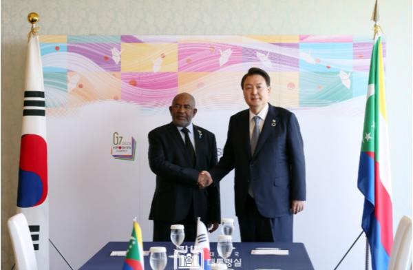 [중앙뉴스라인, 우제헌기자] 윤석열 대통령은 5. 21일 오전 히로시마 G7 정상회의 참석 계기에 아프리카연합(AU) 의장 자격으로 G7 정상회의에 참석한 아잘리 아쑤마니(Azali Assoumani) 코모로 대통령과 정상회담을 가졌다.