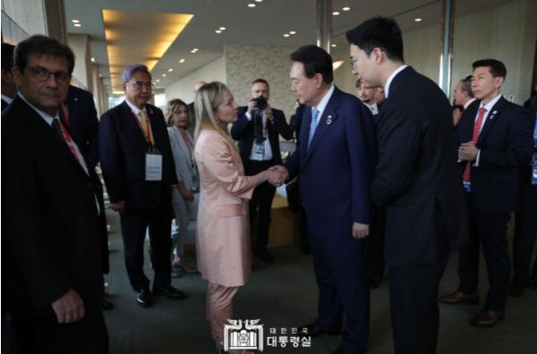 윤석열 대통령, 이탈리아 총리 약식 환담...'폭우 피해 애도와 위로 전해'