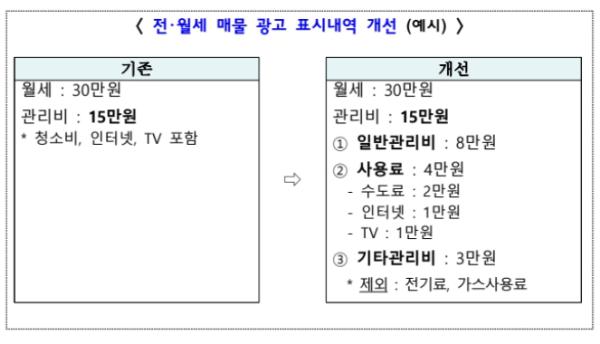 이에, 국토교통부는 전?월세 매물 광고 시 월별로 일정 금액이 부과되는정액관리비에 대해서는 부과내역을 세분화하여 표시하도록 하고, 온라인 중개플랫폼에도 표준화된 입력 기능을 마련하여 임차인이 해당 매물의 관리비 부과내역 등 정보를 명확히 확인할 수 있도록 할 예정이다.