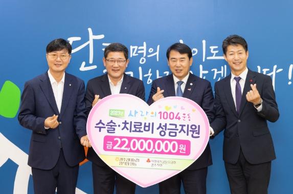 농협중앙회 광주지역본부는 이번 기부를 통해 총 2,200만 원을 광주사회복지공동모금회에 기탁했다. 이는 임직원의 자발적 참여를 통해 지역사회 어려운 이웃에 의료비를 지원하는 나눔과 상생의 활동인 ‘사랑의 1004운동’의 일환으로 이뤄졌다. 기부금은 귀중증질환 등으로 어려움을 겪는 중에도 배움을 포기하지 않는 학생 22명(초 16명, 중 6명)에게 치료비 항목으로 각각 100만 원씩 지원된다.