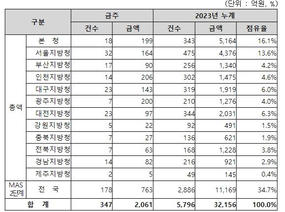 지역별 발주량을 보면, 총액계약 대상 1,298억 원 중 본청이 199억 원으로 15.3%를 집행하고 서울청 등 11개 지방청에서 1,099억 원을 각각 집행할 예정이다.
