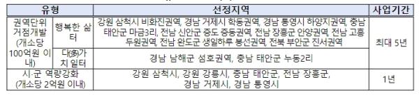 이 중 권역 단위 거점개발인 삶터 및 일터 조성 사업대상지 11개소에는 최대 5년간 총 430억 원의 국비(지방비 184억 원)를 지원하며, 시?군 역량강화 사업대상지 6개소에는 1년간 총 7억 원을 지원한다.