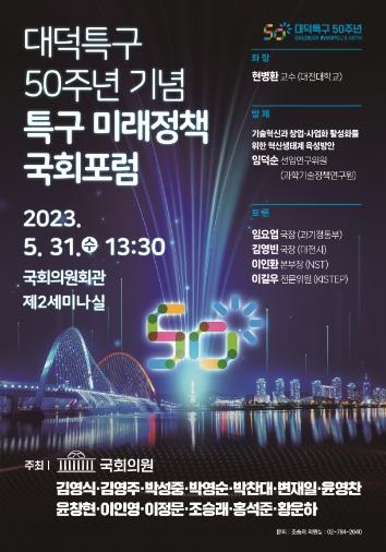 이어 “대덕특구 조성 50주년은 대전뿐만 아니라 대한민국 역사에 큰 의미임에도 정부의 관심이 많이 부족한 것 같다”고 아쉬움을 표하며 “국회 차원에서 대덕특구 50주년 행사 지원 결의안 등을 준비하여 정부와 시민사회 등에 더욱 많은 관심을 촉구하겠다”고 강조했다.