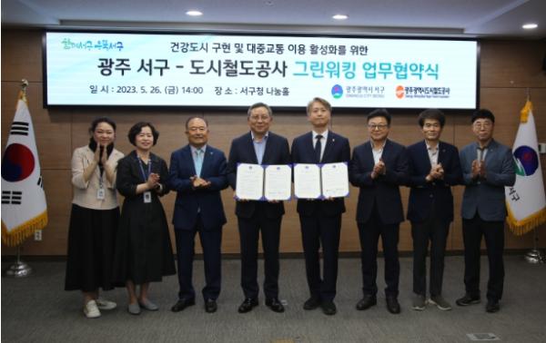 [중앙뉴스라인, 정향훈기자] 광주도시철도공사는 26일 서구청 나눔홀에서 광주 서구와 대중교통 이용 활성화를 위한 ‘그린워킹 업무협약’을 체결했다.