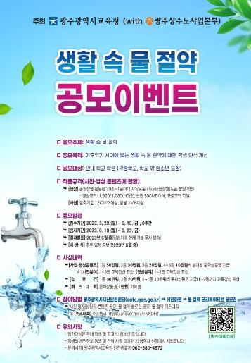 [중앙뉴스라인, 김병연기자] 광주시교육청이 이번 달 29일~다음 달 16일 생활 속 물 절약 공모전을 실시한다.