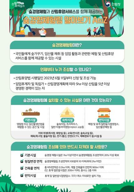 [중앙뉴스라인, 우제헌기자] 산림청은 임업인들의 안정적인 소득기반을 마련하고 국민들이 숲경영 체험과 산림휴양서비스를 복합적으로 즐길 수 있는 숲경영체험림 제도를 2023년 6월 11일 본격 시행한다고 밝혔다.
