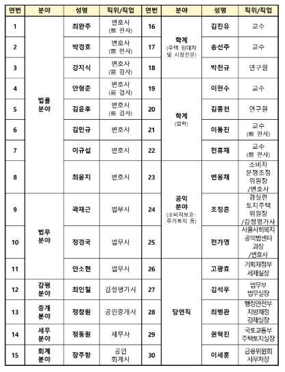 * (민간위원 25인) 전직 판?검사 등 법률전문가 8인, 법무사?감정평가사?공인중개사?세무사? 공인회계사 등 주택 임대차 분야 전문가 7인, 주택 임대차 등 학계전문가 7인, 소비자보호 등 공익활동 경험자 3인 / (당연직 5인) 기재부, 법무부, 행안부, 국토부, 금융위 실장급