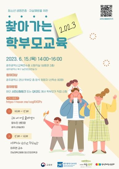 [중앙뉴스라인, 김병연기자] 광주시교육청이 오는 15일 광주교육연수원 시청각실에서 관내 학부모 대상으로 ‘청소년 생명존중·자살예방을 위한 ’2023년 찾아가는 학부모교육‘을 실시한다.