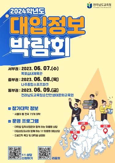 [중앙뉴스라인, 차행운기자] 전라남도교육청이 오는 7일 목포실내체육관, 8일 나주종합스포츠파크, 9일 전라남도교육청순천만생태문화교육원에서 2024학년도 대입정보 박람회를 개최한다.
