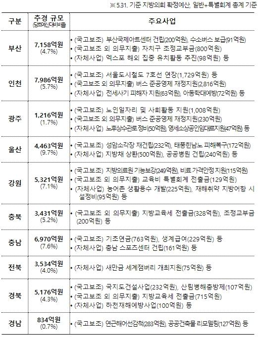세출 측면에서 보면 각 지자체는 어려운 재정여건에도 불구하고 사회적 취약계층을 지원하고, 민생 안정과 지역경제 회복 등을 위한 필수적 사업을 추경을 통해 최대한 반영하기 위해 노력하고 있다.