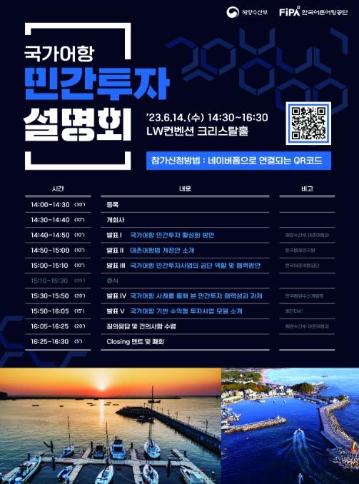 이번 설명회에서는 민간기업의 투자유치를 위해 국가어항 민간투자 활성화 방안과 ?어촌·어항법? 개정안 등 정책과 법?제도의 주요내용을 소개한다. 또한 국가어항별로 적합한 수익모델과 경제성 등 투자 이점도 홍보할 계획이다.