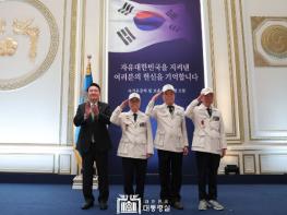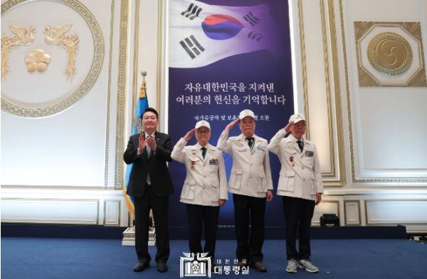 대통령은 오찬에 앞서 대한민국6·25참전유공자회 손희원 회장, 이하영 이사, 김창석 이사 세 분에게 영웅의 제복을 직접 입혀드리고 '121879 태극기 배지'을 달아드리며 국가에 헌신한 영웅들을 격려했다.