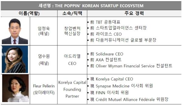 곧이어 이어진 ‘성장하는 한국 창업생태계(The Poppin’ Korean Startup Ecosystem)’ 토론(패널) 이야기(토크)에서는 중소벤처기업부 임정욱 창업벤처혁신실장과 ‘코렐리아 캐피탈’의 플뢰르 팰르랭 대표, ‘아드리엘’ 사의 엄수원 대표가 토론자(패널)로 참여했다. 토론자(패널) 이야기(토크)에서는 비바텍 ‘올해의 국가(Country of the year)’로 선정된 한국의 창업생태계 발전과정과 우수한 창업기업(스타트업) 사례, 미래 성장 가능성 등에 관한 폭넓은 논의가 진행됐다.