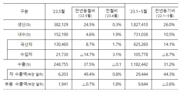 이처럼 자동차 수출이 역대 최고 수준을 기록한 것은 차량용 반도체 등 부품공급 정상화로 차량 생산량이 뒷받침됐기 때문이다. 5월 생산량은 전년동월 대비 24.5% 증가한 38.2만 대를 기록하며 높은 증가율을 보였다. 올해 5월까지 생산량은 총 182.7만 대로 '19.1∼5월 생산량 169.5만 대를 뛰어넘어 코로나19 이전 수준 이상 회복한 것으로 나타났다.