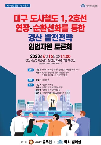 [중앙뉴스라인, 우제헌기자] 윤두현 국회의원(국민의힘, 경북 경산시)은 16일 오후 2시 경산시농업기술센터에서 국회 법제실과 공동으로 ?대구 도시철도 1,2호선 연장·순환선화를 통한 경산 발전전략 입법지원 토론회?를 연다고 15일 밝혔다.