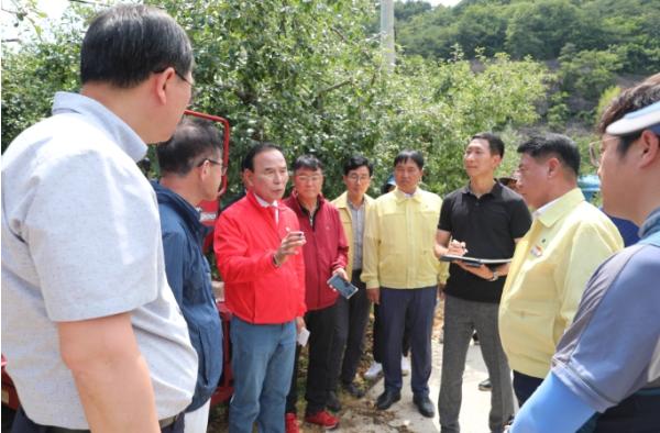 이에 박덕흠 의원은 △정영철 영동군수와 △농림축산식품부, △충북도, △농협 관계자 등과 함께 영동군 양강면에 위치한 사과, 복숭아 과수 농가를 방문하여 우박 피해 현장을 직접 확인하고, 정부와 지자체, 농협이 농민들의 현장 의견이 반영된 지원 대책을 신속히 마련해 달라고 강력 요청했다.