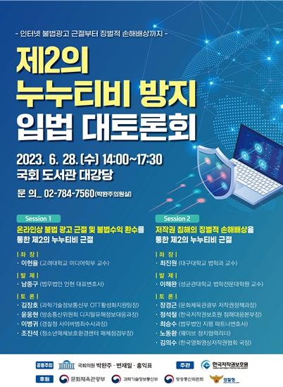 이어 ‘저작권 침해의 징벌적 손해배상을 통한 제2의 누누티비 방지’라는 주제에서는 최진원 대구대학교 법학과 교수가 좌장을 맡고 이해완 성균관대학교 법학전문대학원 교수가 발제할 예정이다. 토론 패널로는 장경근 문체부 저작권정책과장, 정석철 한국저작권보호원 침해대응본부장, 최승수 법무법인 지평 파트너변호사, 노동환 웨이브 정책협력리더, 김의수 한국영화영상저작권협회 사무국장이 참여할 예정이다.