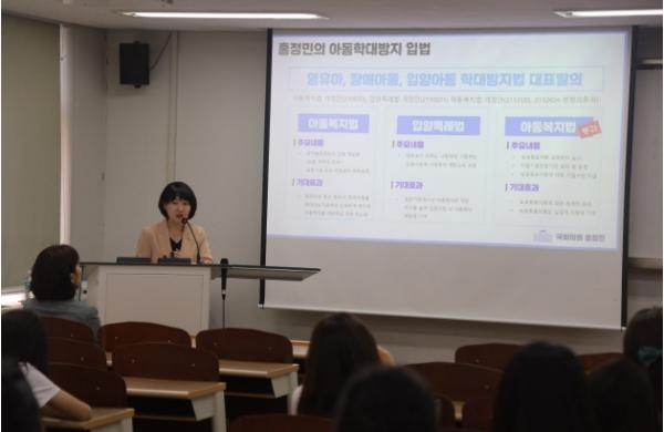 이번 특강은 아동보호와 아동권리 증진을 위한 홍정민 의원의 입법?정책 활동을 중심으로 이어졌다. 홍정민 의원은 제21대 국회의원이자 두 자녀를 키우는 엄마로서 아동복지와 아동인권보호를 위한 정책, 입법 활동을 이어왔다. ‘우리 아이 함께 키우는 국회의원 모임’소속이기도 하다.