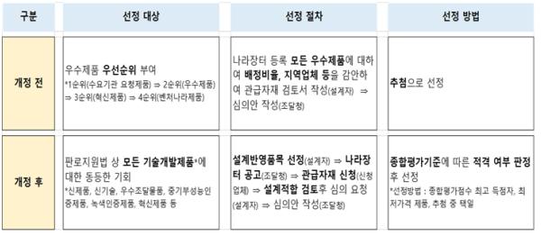개정 이후에는 관급자재 매칭 플랫폼을 통해 각 사업별·품목별로 설계자가 설계의도와 필요한 기술을 공고하고 해당되는 관급자재 업체가 신청하는 방식으로 선정 절차를 개선했다.