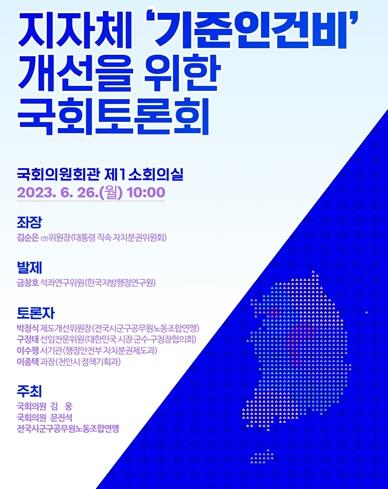 문진석 의원과 국민의힘 김웅 의원, 전국시군구공무원노동조합연맹(위원장 공주석)이 공동주최하는 이날 토론회는 김순은 전 대통령직속 자치분권위원회 위원장이 좌장을 맡아 진행하며, 금창호 한국지방행정연구원 석좌연구위원이 발제를 맡아 ‘지방자치단체 기준인건비제도 개선방안’을 주제로 발표한다.