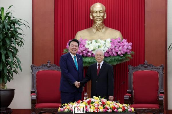 [중앙뉴스라인, 우제헌기자] 베트남을 국빈 방문 중인 윤석열 대통령은 6월 23일 한-베트남 정상회담 및 총리 면담에 이어, 같은 날 오후 베트남 중앙당사에서 응우옌 푸 쫑(Nguyen Phu Trong) 당서기장을 면담하고 양국 관계의 미래 발전 방안에 대해 논의했다.