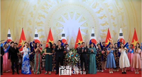 베트남 태고 연주단의 연주로 시작된 국빈만찬은 베트남 전통 모자 공연과 한국 부채춤으로 이어졌으며, 공연단의 마지막 아리랑 합창 순서에서는 윤석열 대통령과 김건희 여사, 트엉주석 내외가 함께 무대에 오르며 2시간 넘게 이어진 신뢰와 우정의 시간을 마무리 했다.