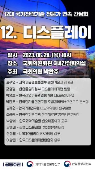 [중앙뉴스라인, 우제헌기자] 국회 과학기술정보방송통신위원회 소속 박완주 의원(충남 천안을·3선)이 과학기술정보통신부?산업통상자원부와 공동 주관으로'12대 국가전략기술 전문가 간담회⑫- 차세대 디스플레이 기술 개발 및 시장 전략'을 오는 29일 목요일 오전 10시 국회의원회관 제4간담회의실에서 개최한다.
