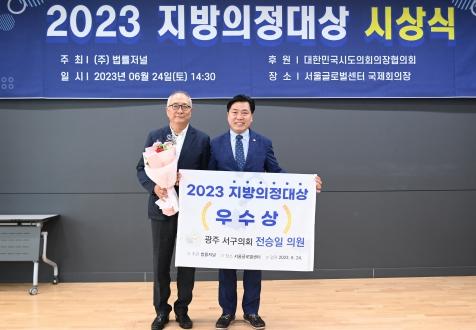 [중앙뉴스라인, 백흥순기자] 광주 서구의회 전승일 의원(농성1·2동, 화정1·2동, 양동, 양3동)이 전국243개 지차체 중 49명을 선정한 법률저널 주관 2023지방의정대상에서 광주 5개 자치구에서 유일하게 입법활동부문 우수상을 수상했다고 밝혔다.