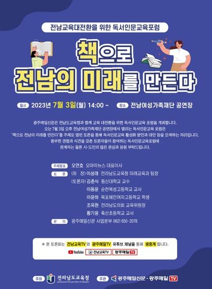 전라남도교육청은 오는 7월 3일 오후 2시 전남여성가족재단 공연장에서 ‘책으로 전남의 미래를 만든다’를 주제로 독서인문교육포럼을 개최한다고 28일 밝혔다.