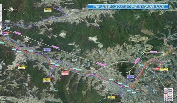 '군내~일동배수지 구간 송수관로 복선화'는 현재 군내배수지에서 영북배수지까지 단일 송수관로로 수돗물을 공급하고 있는데, 이를 군내에서 일동배수지까지 14km 구간 송수관로를 복선화하는 사업이다. 총사업비 352억원이 투입되며, 올해 8월 착공되어 2025년 12월 준공될 예정이다.