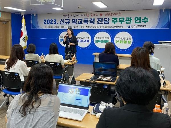 전라남도교육청은 6월 26일부터 6월 28일까지 교육지원청의 2023년 신규 학교폭력 업무 담당자를 대상으로 ‘학교폭력 불복 사례를 줄이고, 교육적 지원을 강화하기 위한 방안’을 주제로 연수를 진행했다